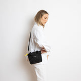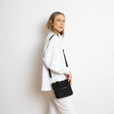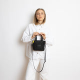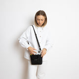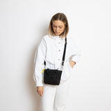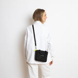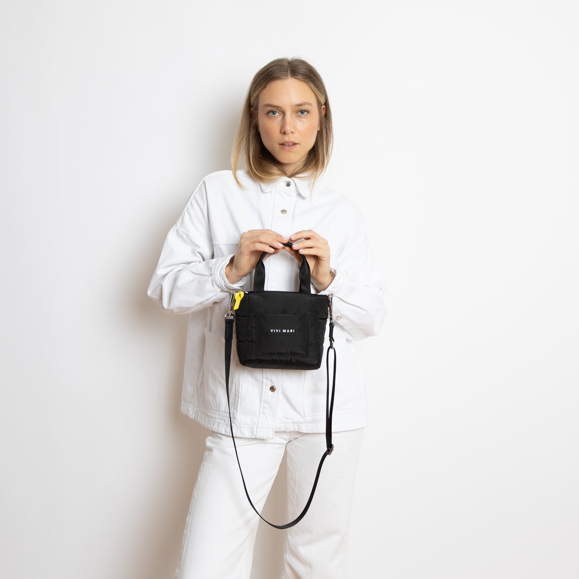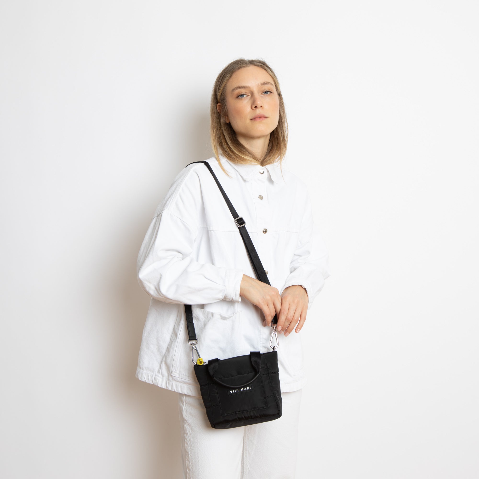 The bag is 100% vegan and made from recycled materials. The size offers space for your most important items: large smartphone, small wallet, handkerchiefs, lipstick, sunglasses, keys.